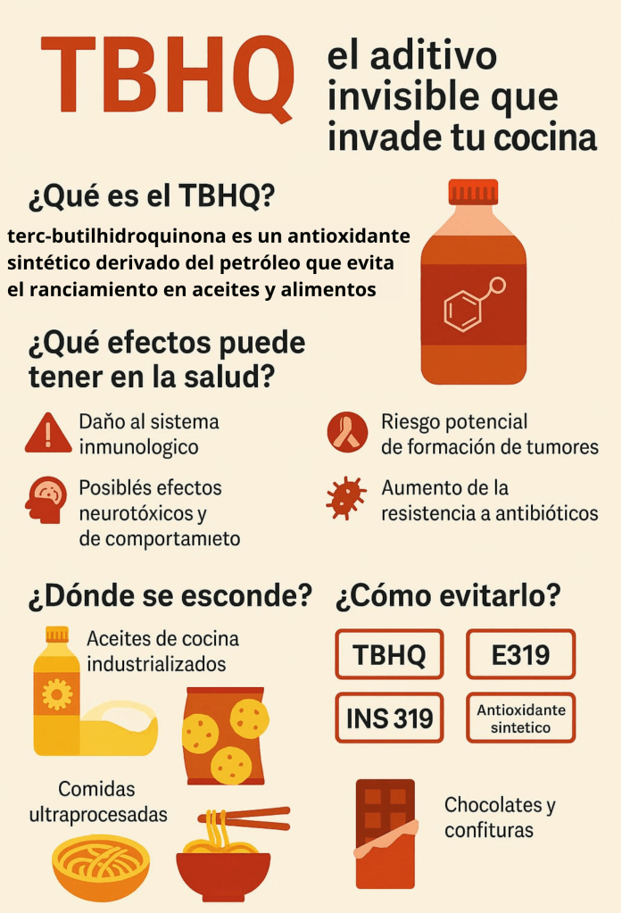 El TBHQ (terbutilhidroquinona) es un antioxidante sintético derivado del petróleo. También conocido como INS 319 o E-319, su función es simple: evitar que las grasas y aceites se enrancien o se pongan feos, extendiendo así la vida útil de los productos industrializados.